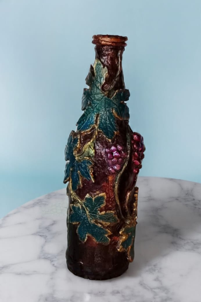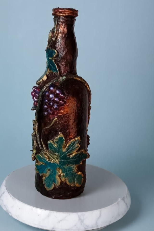 Elegant & Stylish: Metallic Leaf and Berry Handcrafted Clay Bottle