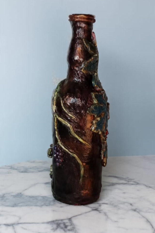 Infuse your home with refined, nature-inspired charm using this magnificent handcrafted clay bottle art. It showcases intricate leafy motifs and berries, meticulously hand-painted in sophisticated metallic shades (e.g., gold, bronze, or silver accents) to provide a stylish and timeless aesthetic.